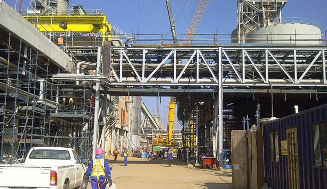 This project comprised the fabrication and erection of pipe racks, structures and platforms (left) to the Sappi operating plant in Ngodwana. The project also included the erection of the refiner building that was erected with a 275-ton self-erecting tower crane. On-site challenges included access and congestion, requiring extensive planning and coordination of activities.